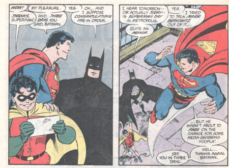 Imagine superman returns filmed with christopher reeve and margot kidder's characterization of clark kent and lois lane.. It's not an s // superman by loz. Batman was the only one available and the fittest for this mission.